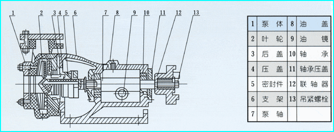 4、機(jī)械密封:采用WB2型、ST型不用冷卻水可調(diào)式端面密封技術(shù),由碳化硅、高純度氧化鋁陶瓷、填充四氟、石墨等材料制成。